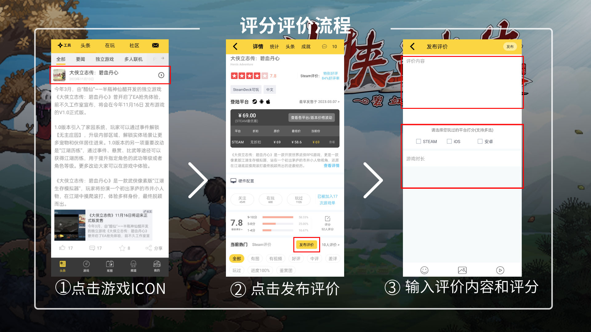 【给《大侠立志传:碧血丹心》打分并评价抽5张100元京东卡】《大侠立志传:碧血丹心》V1.0版本已正式发售,各位踏入江湖的少侠们喜欢这款江湖生存模拟器吗?从3月份EA版一直持续更新到现在,不断丰富的内容和玩法是否满足了你对武侠RPG的期待?欢迎大家在《大侠立志传:碧血丹心》详情页写下自己的游玩体验,我们将从活动时间内所有同时完成新评分+发布新评价的玩家中抽取5名幸运玩家赠送100元京东卡(注:在此条资讯底下发表评价不算参加活动,只有按照下图一去游戏详情页评分评价才算)