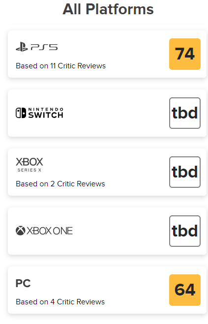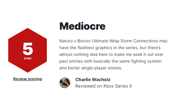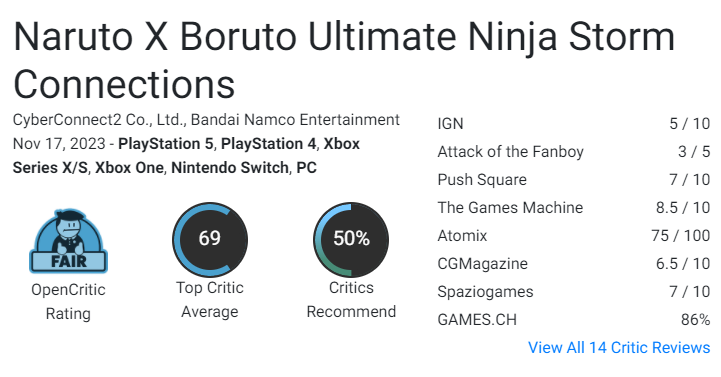 【《火影忍者:终极风暴羁绊》MC均分74】火影忍者20周年纪念作《火影忍者:终极风暴羁绊》现已正式发售,目前本作在MC上PS5版均分为74(11家媒体给出)、PC版64(4家媒体给出);opencritic上均分69(暂收录14家媒体),其中IGN为游戏打出了5分。