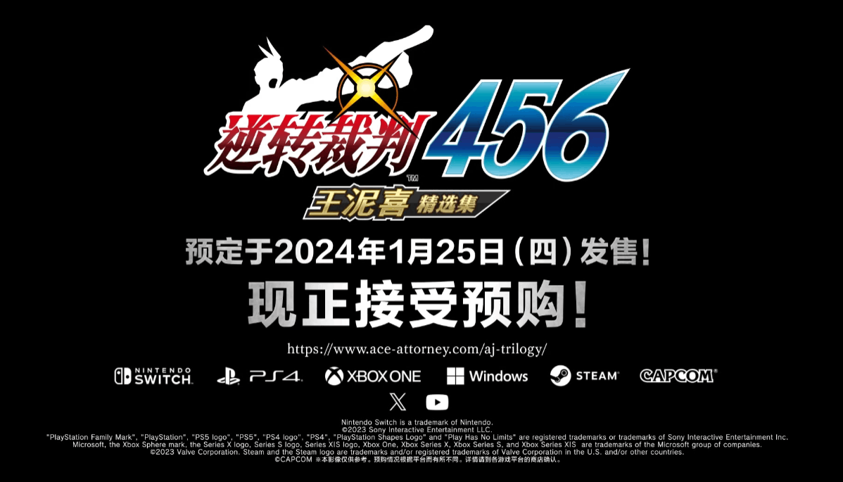 【《逆转裁判456:王泥喜精选集》最新中文预告公布,现已开启预购】Capcom今日公布了《逆转裁判456:王泥喜精选集》的最新中文预告片,并开启了游戏的预购。本作收录了新人律师王泥喜法介的成长故事和法律界黑暗时代的3部作品,以更精致的高分辨率画像为玩家们所带来了逆转456完整版!游戏包含原版的特别追加内容、提供了3位律师的特殊服装、可欣赏BGM和管弦音乐会曲目的“交响乐团大厅”、能鉴赏原设计图的“艺文图书馆”、可仔细观赏角色动画的“动作播放室”以及提供能自动选择选项与推送文字的“故事模式”。 《逆转裁判456:王泥喜精选集》将于2024年1月25日登录NS/PS4/Xbox One/Windows/Steam,游戏支持中文字幕以及配音。
