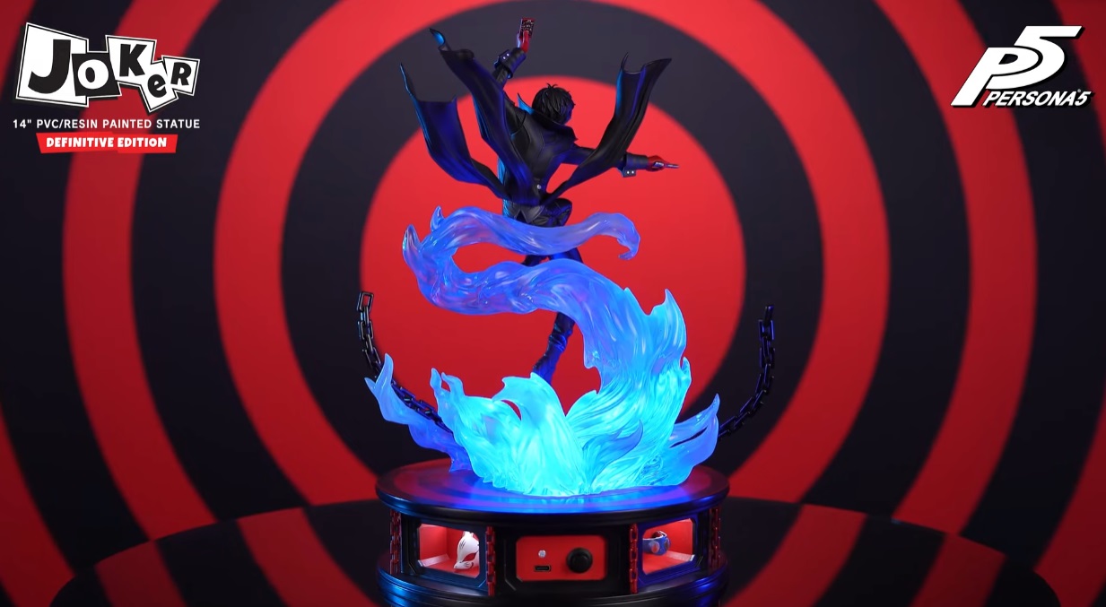 【First 4 Figures《女神异闻录5》Joker雕像即将开订】First 4 Figures近日公布了《女神异闻录5》Joker雕像的预览。此次产品采用了角色迷宫中佩戴面具的经典外观,并以极具动态的造型呈现。该雕像公布了两个版本,其一普通款,以游戏里华丽的UI为灵感设计的底座是其最大特点;另外一款则是以觉醒为主题,用LED灯还原原作中的蓝色火焰,下方底座则展示了怪盗团们的面具。产品将于12月5日开启预约,届时公布售价以及发售日。