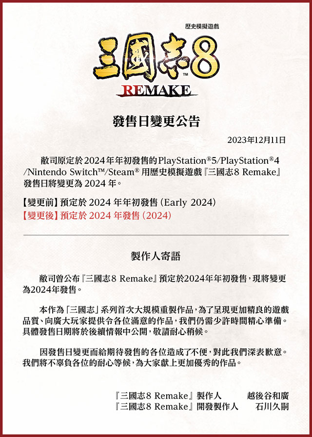 光荣特库摩宣布《三国志8:重制版》延期发售