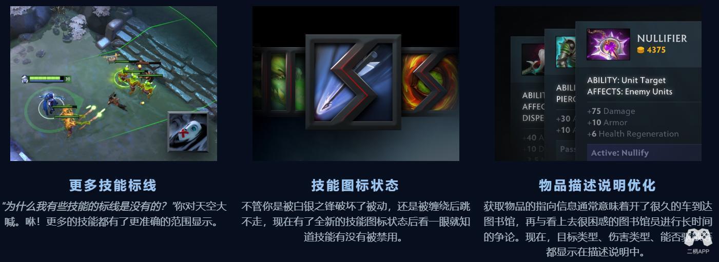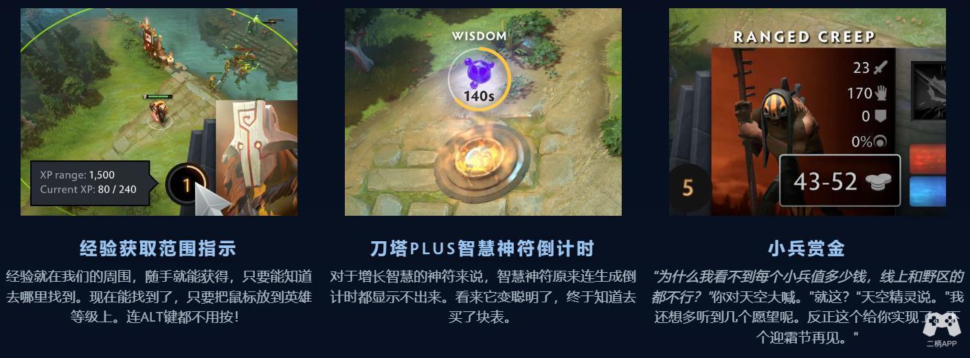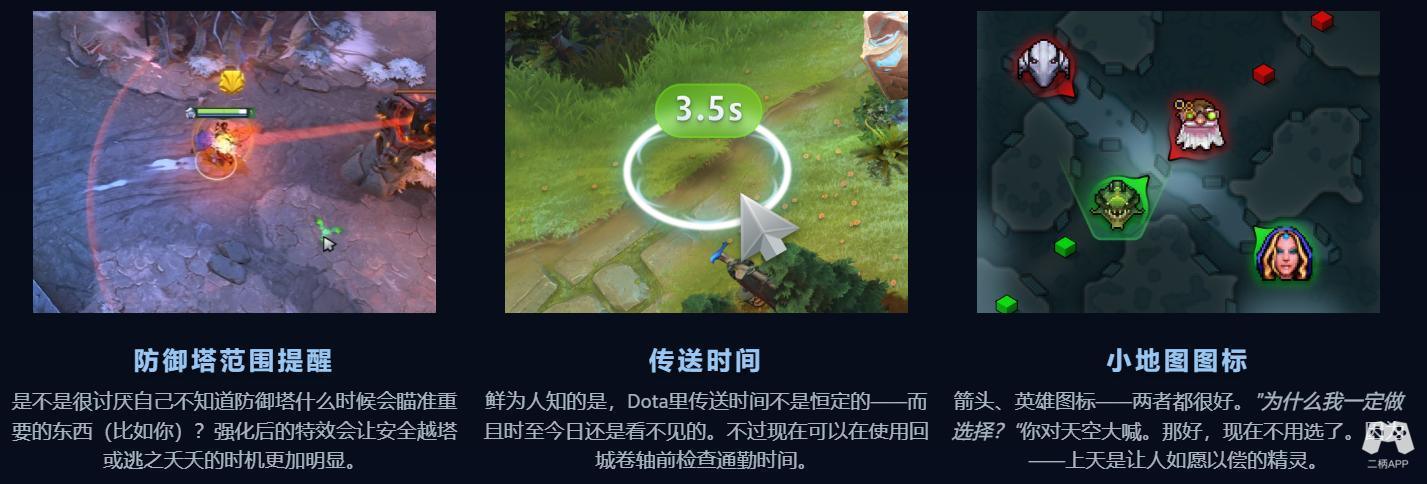 本次更新客户端优化了诸多信息提示,包括防御塔范围提醒、传送时间、小地图图标、更多技能标线、技能图标状态、物品描述说明优化、经验获取范围指示、刀塔PLUS智慧神符倒计时、小兵赏金等。