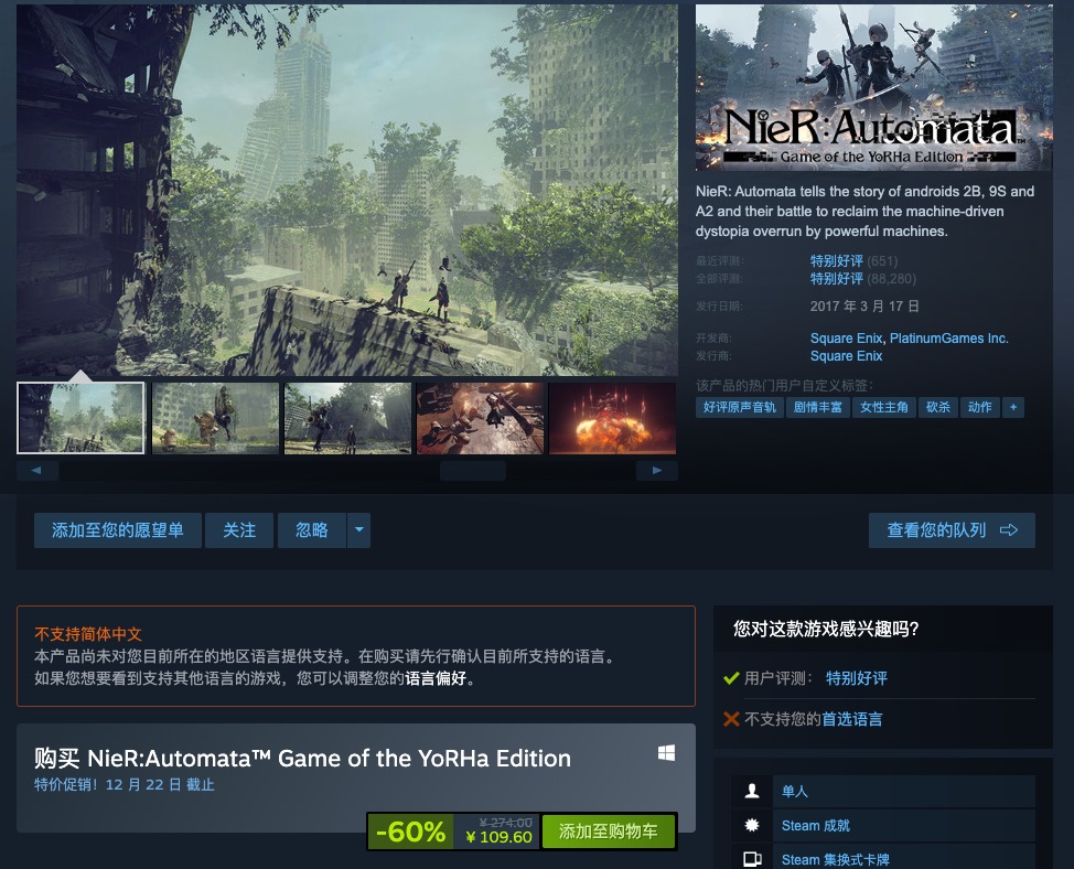 【《尼尔:机械纪元》年度版新史低】SE近日在Steam平台开启了冬季促销活动,其中《尼尔:机械纪元》年度版以4折的新史低折扣,仅需109.6元便可收入囊中。新史低也帮助该游戏一举进入国区热销榜单。此外,2021年发售的《尼尔:人工生命升级版》也在SE冬促期间提供4折优惠,仅售143.6元。还没入手的玩家不妨考虑一下。