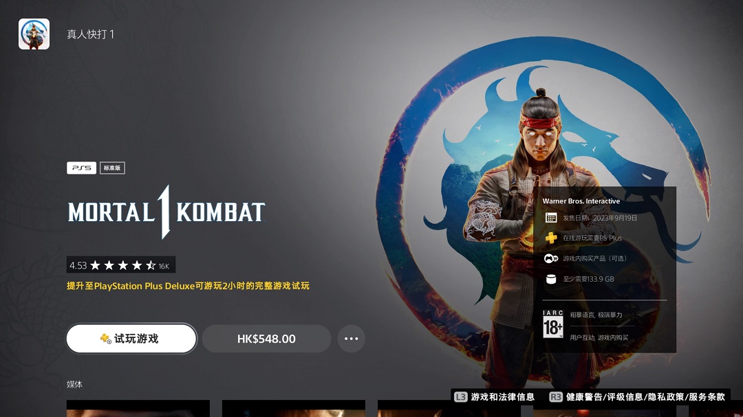 【PS+3档试玩追加《真人快打1》,可免费体验游戏2小时】PSN HK商店近日为PS+3档会员玩家添加了《真人快打1》的试玩,订阅了该档位服务的玩家可以免费体验这款格斗游戏2小时。其中数据可以在正式版中得到继承,本作的大小约为133.9GB。《真人快打1》于今年9月发售,游戏目前在PS商店上的玩家评分为4.53(16279个评价),其中给出5星好评的人数约74%。需要注意的是本作PS5版并不支持中文。