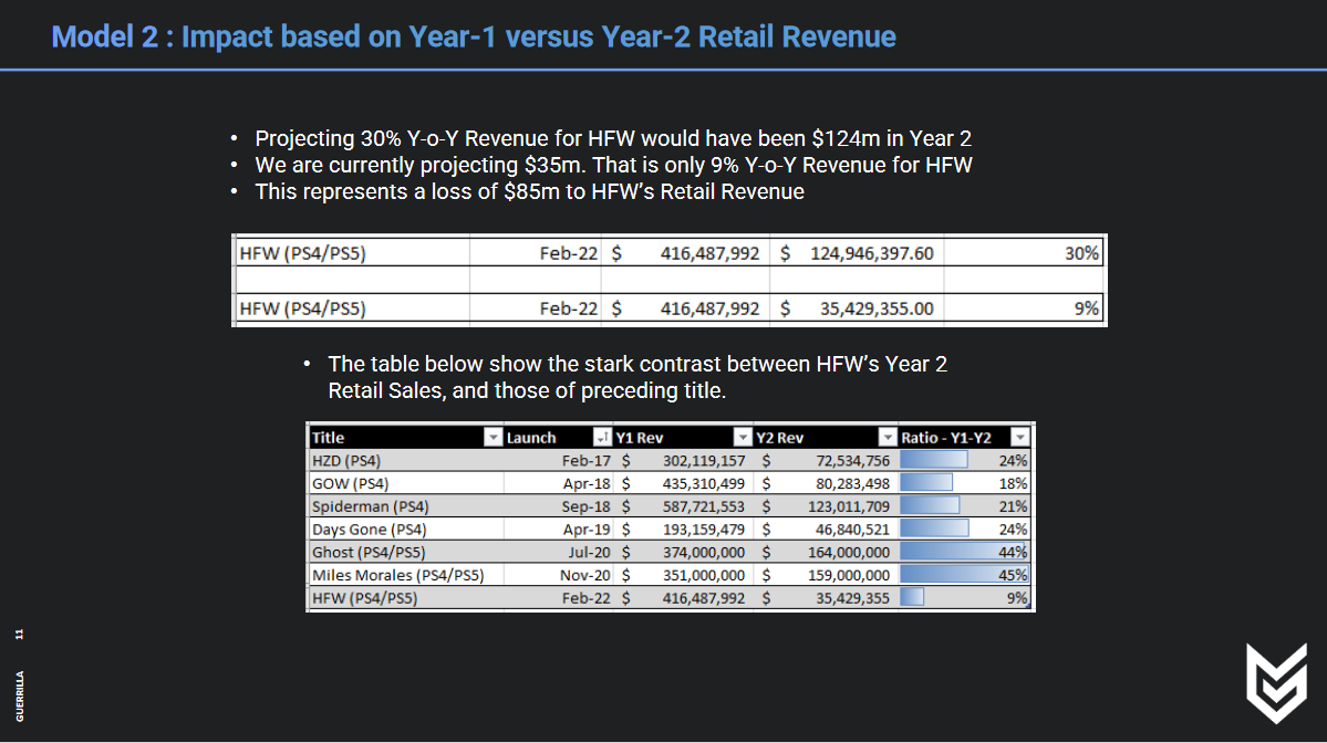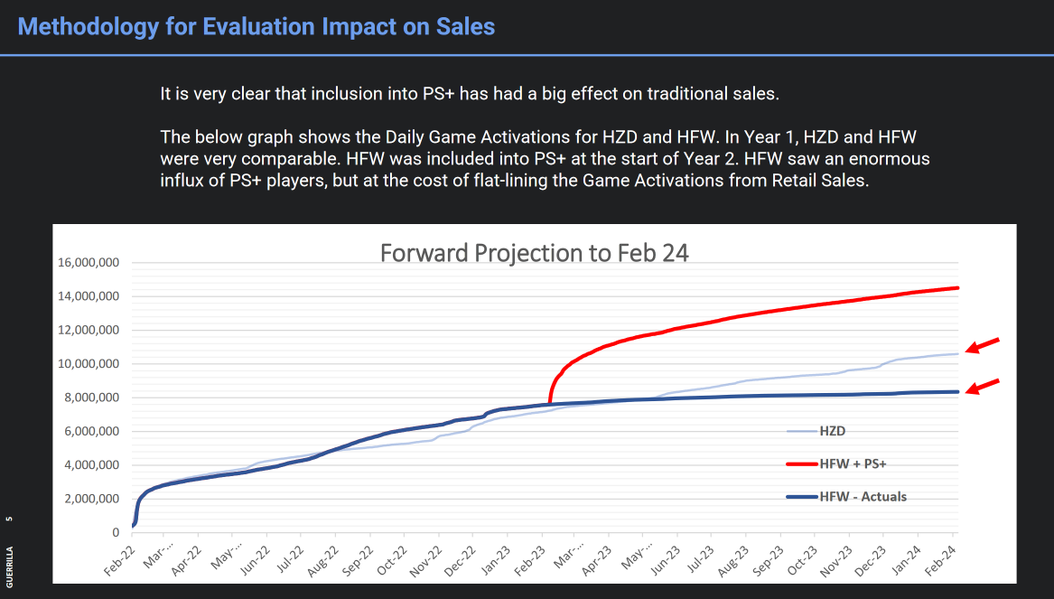 【《地平线:西之绝境》加入PS+后预计零售收入损失8500 万美元】《地平线:西之绝境》于2022年2月发售,一年后游戏加入PS+游戏库。根据近日黑客公布的失眠组内部文件显示,本作入库后对游戏销售的影响巨大。索尼将《地平线:西之绝境》和前作《地平线:零之曙光》进行了比较,两者在发售头一年内的数据曲线基本一致,而在《西之绝境》加入PS+后两者的差距有了明显的变化。据悉,《西之绝境》预计第二年的销售收入同比增长30%,达到1.24亿美元,加入PS+后索尼将预期下调至9%(3500万美元),也就是说零售收入损失了近8500万美元。