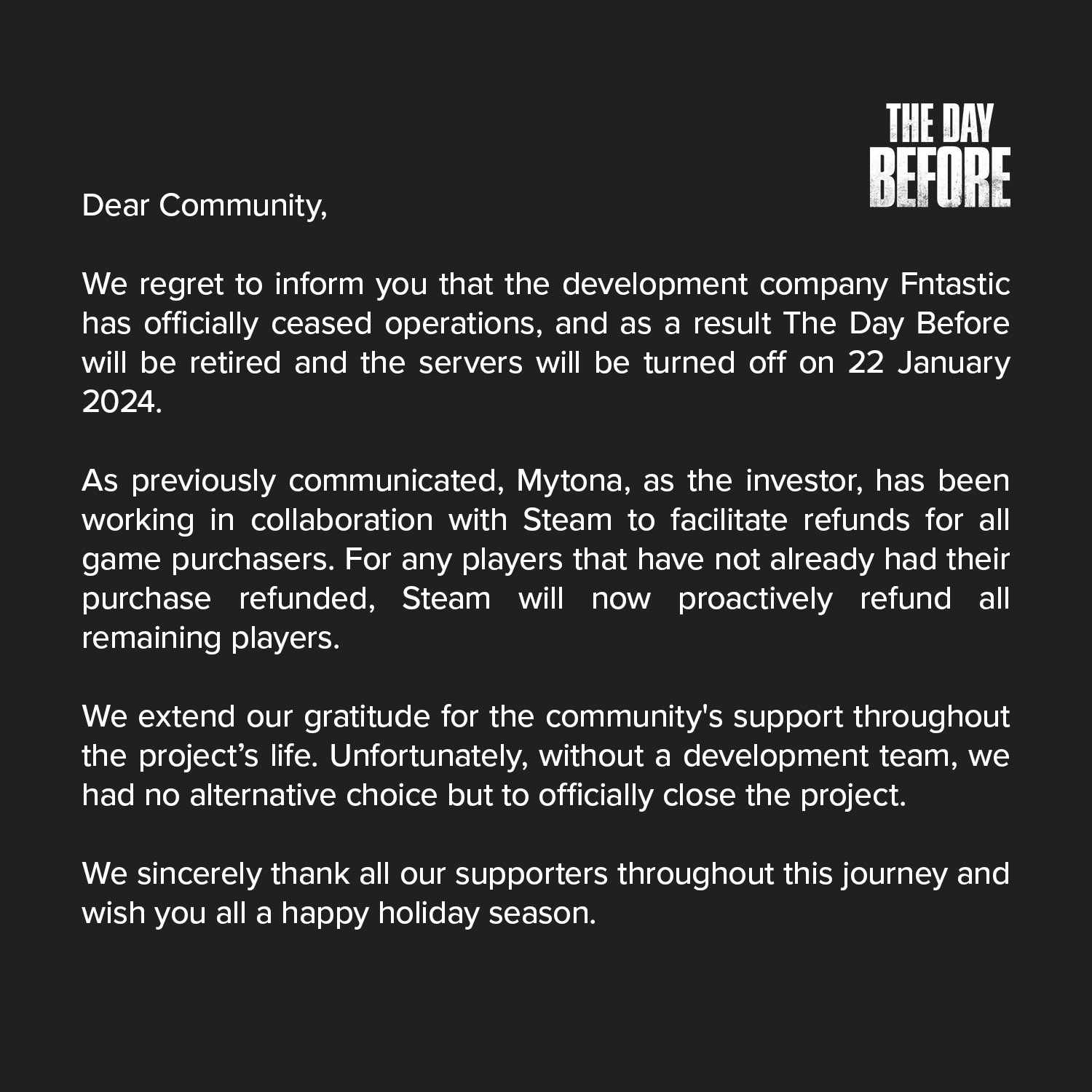 “很遗憾地通知大家,开发商Fntastic已正式停运,故《浩劫前夕》的服务器也将于2024年1月22日关闭。作为投资者我们一直与Steam合作为玩家们退款,之后对于尚未提出退款的人,Steam会主动将金额退还。感谢大家的支持,但由于没有开发团队,我们别无选择只能永远关闭项目。”