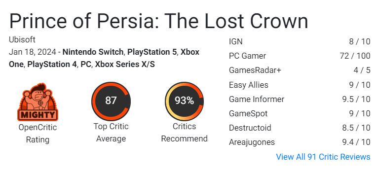 《波斯王子:失落的王冠》MC均分86,获IGN8分、GS9分评价