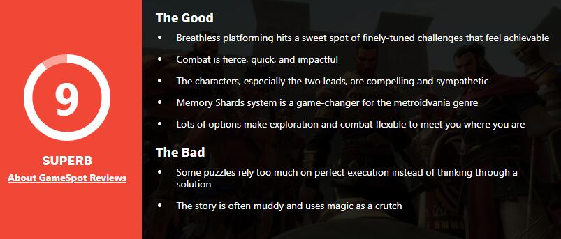 GS:本作是《波斯王子》这个长久系列中的一个巨大变革,它与《时之砂》一样有着重要的地位。巧妙的平台设计、激烈且流畅的战斗、深入人心的角色刻画都令人十分满意。特色系统又能带来属于自己的“银河城”特色。不过有些谜题过于依赖操作而不是思考如何去解决,并且剧情故事有些混乱。
