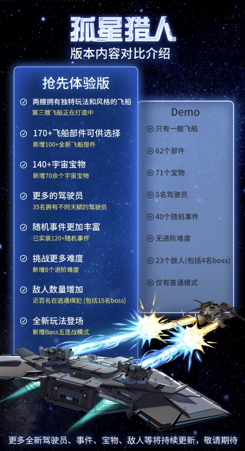 除此之外,EA版《孤星猎人》还有一艘隐藏飞船待玩家解锁,这艘神秘飞船将给予船长更广阔的想象空间。当然,第三艘飞船也在紧锣密鼓地打造之中,更多驾驶员与敌人将陆续公布,让我们拭目以待。