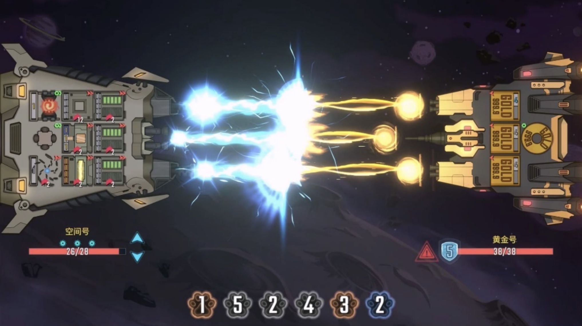 空间号,28点血量,可以在战斗中交换部件位置,初始拥有3点换位次数。可以变动部件位置的空间号能更从容地应对敌人的集火,为其量身定制的部件与技能似乎也更加强力,但部件的负载也更高。是轻装上阵还是重装出击?不同飞船的策略维度不尽相同。