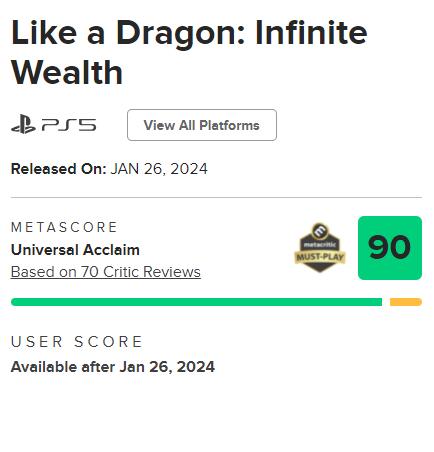 【《人中之龙8》目前为系列评分最高的作品】《人中之龙8》全球媒体评测已于昨晚正式解禁,截至目前本作在M站上的均分为90(PS5版分数最多,由70家媒体给出)。若后续没有大幅下降的话,那么这个分数会使其成为该系列评分最高的作品。其中VGC、Atomix、TheGamer等媒体以集大成之名为游戏打出了满分;IGN因本作没有提供简单难度选项而给出了9分,gamespot则称游戏在剧情叙事上存在问题,故打出了8分。以下为《人中之龙》系列作品在M站上的分数: