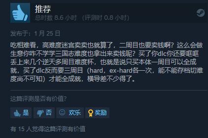 【《人中之龙8》Steam上获“特别好评”】由世嘉带来的《人之中龙》系列最新作《人中之龙8》现已在Steam平台上发售。截至目前,已有483篇评测,玩家好评率为89%,整体为“特别好评”。对于游戏的质量玩家们普遍给予了认可,颇具诚意的中文配音、丰富的内容、玩法的提升以及优化都比较令人满意。虽然也有人表示遇到了一些BUG,如无法拾取道具和闪退等现象,不过大部分差评主要集中在开发团队将新游戏+模式放在了DLC中(终极度假包售价129元)。《人中之龙8》国区标准版售价349元、豪华版389元、究极版459元,游戏支持中文字幕和配音。