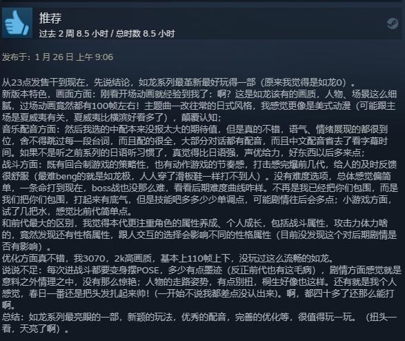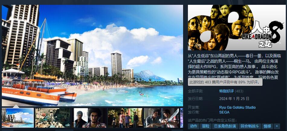 《人中之龙8》Steam上获“特别好评”