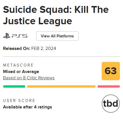 【《自杀小队:战胜正义联盟》MC均分63:重复内容和微交易为减分项】《自杀小队:战胜正义联盟》于今日正式发售,购买了豪华版的玩家已在上月29日抢先体验了本作。不过当天因游戏出现自动完成错误,使得服务器被紧急关闭,随后官方宣布将提供价值20美元的游戏币作为补偿。此前IGN等媒体透露官方拒绝提供游戏的评测码,所以虽然本作评测现已解禁,但MC站上目前只收录了8家媒体,PS5版均分63。其中VGC给出了最高的8分,认为游戏虽然重复的任务和价格昂贵的微交易很不友好,但在视觉效果和战斗等内容上还是比较有趣的。Areajugones打出了最低的4分,他们觉得游戏重复的内容令人发腻、次要任务也极其无聊,并且还需要全程联网。IGN表示游戏还在评测中,在体验了约11个小时的主线后感觉其内容好坏并存。