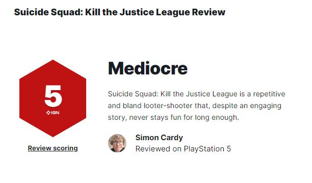 【《自杀小队》获IGN5分评价:众多拙劣设计的服务型游戏】《自杀小队:战胜正义联盟》因为官方拒绝给媒体事先发评测码故而在游戏上市后评测很少。之前IGN表示无法及时给大家带来评测而感到遗憾。目前游戏在MC上PS5版有21家媒体给出了评分,均分为61,其中IGN打出了5分。