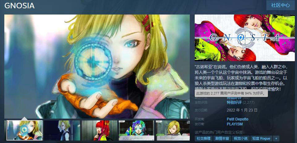 【春节宝藏游戏推荐】虽然这是一款仅由四人组成的小团队所创造的独立作品,但却是当年IGNJP的满分神作、PSV最后的荣光,它就是于2019年上市的SF文字冒险游戏《古诺希亚》!本作以狼人杀的玩法为基础,用视觉小说的形式讲述了玩家在无数次轮回中解开谜团,拯救命运的故事。其中精美的画风、刻画到位且个性十足的14名角色、非常规的游戏机制,搭配精彩纷呈的剧情使得本作推出后获得了众多玩家和媒体们的好评。《古诺希亚》由Petit Depotto制作,Playism发行,游戏于 2022年在Steam上推出了中文版,目前该平台上已有2277条评测,其中玩家好评率高达94%。本作现正在进行8折促销中,折后价64元,截至2月16日,喜欢此类作品的玩家不妨一试。