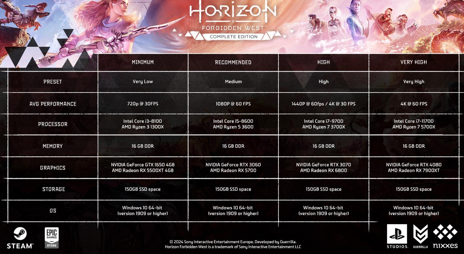 【《地平线:西之绝境》完整版PC配置要求及表现情况公布】《地平线:西之绝境》完整版即将于3月21日登录PC,PlayStation今日公布具体配置要求,详情如下: