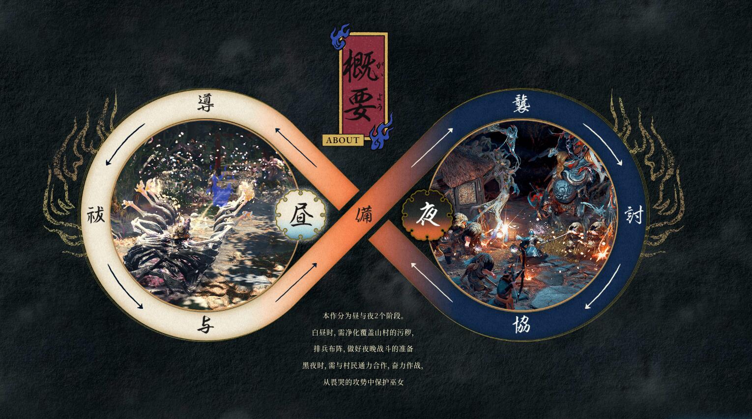 本作是一款可以体验到“动作与策略”乐趣的单人神乐战略活剧。游戏以被污秽覆盖的山村为舞台,玩家在白天需净化村落并做好战斗准备;黑夜时与村民合作对抗妖魔来袭,守护巫女。