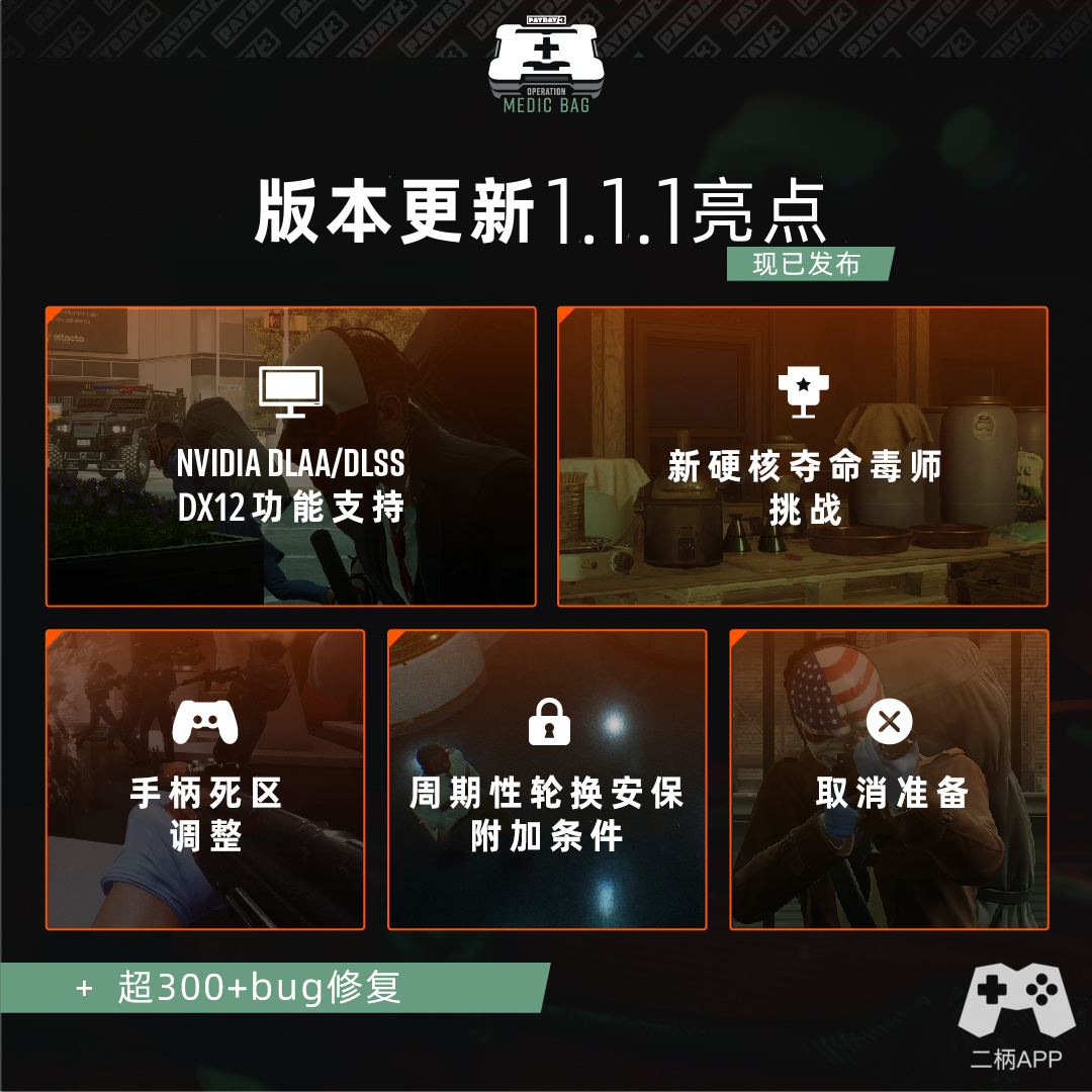 游戏目前已经发布了“医疗包行动”的首个更新补丁,这当中包括了“取消准备”和手柄个性化调整的功能,加入了Nvdia功能的支持以及多达300余项的修正和调整;其中硬件功能的支持上,不仅支持Nvdia的NIS、DLAA以及DLSS等画质提升功能,同时也将最新的DX12图像API引入进来,以提升游戏性能表现。
