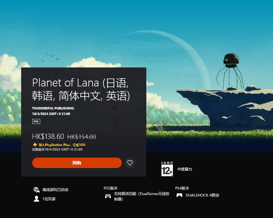 【《拉娜星球》将登陆NS和PS,此前仅可在Steam、Xbox游玩】《拉娜星球》于2023年5月23日发售,登陆Steam和Xbox,并首发加入XGP,目前本作Steam评级为特别好评。开发商Wishfully Studios宣布,本作将在4月16日在NS和PS4、PS5上发布。本作在PSN HK商店预购价为154HKD,预购用户将获得10%的折扣,折后价为138.6港币。eShop US售价19.99美元,预购折扣后为17.99美元。《拉娜星球》讲述了一个跨越广阔星系与时空的科幻故事,游戏中小女孩将与她的同伴踏上拯救世界的冒险之旅。