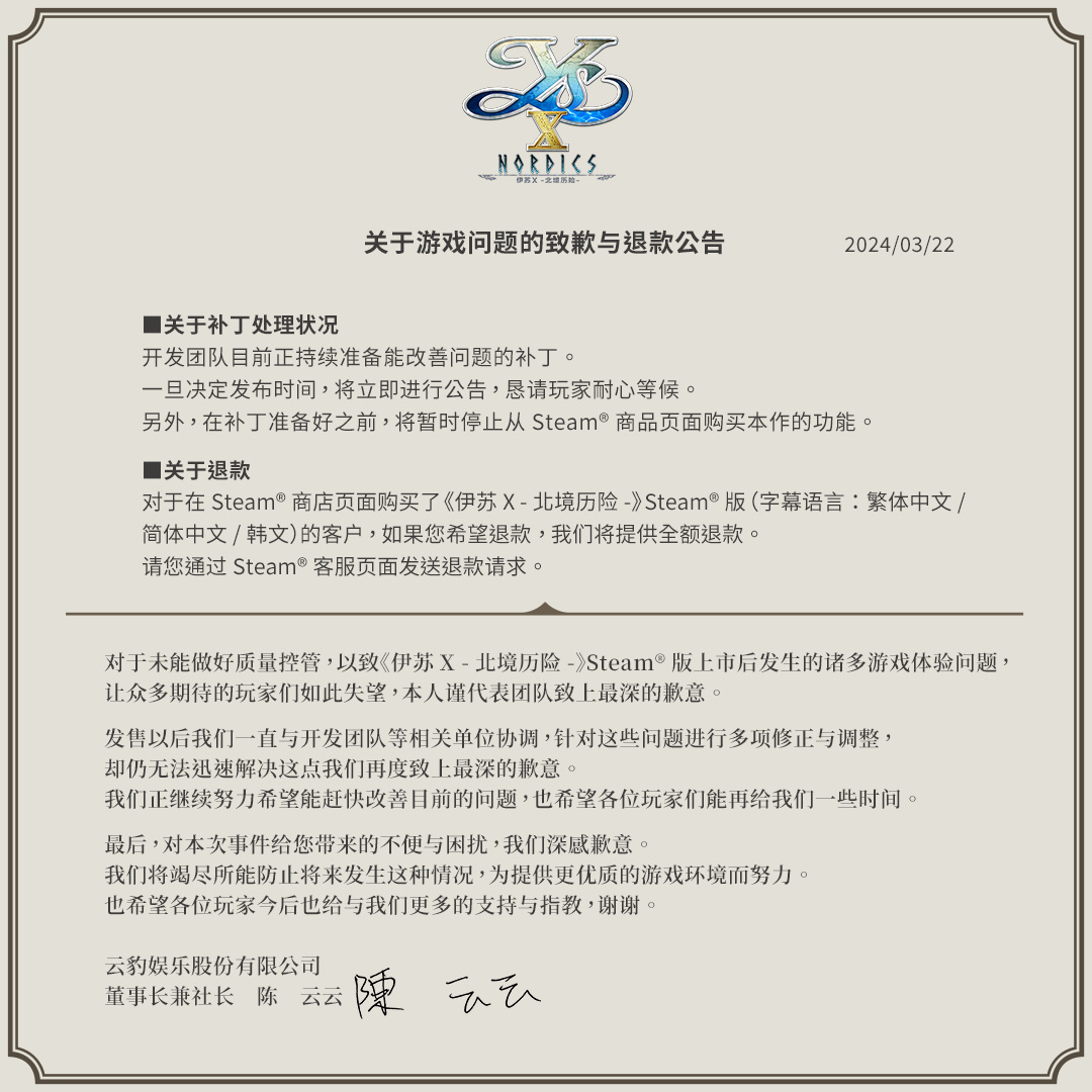 【《伊苏10》Steam版由于优化问题已被暂时下架,已购玩家可全额退款】云豹娱乐今日宣布,于3月14日在Steam上所推出的《伊苏10:北境历险》因存在优化等影响游戏体验的问题,故决定暂时将本作进行下架处理并向所有玩家致歉。目前已知问题包括“帧数极度下降”“无法更改键盘操作并且游戏中显示说明不正确”“游玩途中死机”。官方表示,修复补丁正在制作中,待确定好发布更新与销售再开日期后会在Steam商店页面进行公告。已经购买了本作的玩家可通过Steam客服页面申请全额退款。《伊苏10:北境历险》是Falcom人气ARPG游戏“伊苏”系列的最新作,截至目前本作在Steam上已有161条评测,玩家好评率仅有28%。