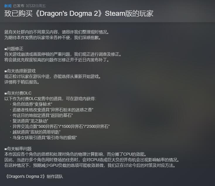 官方向《龙之信条2》Steam版玩家致歉,承诺近日推出修复补丁