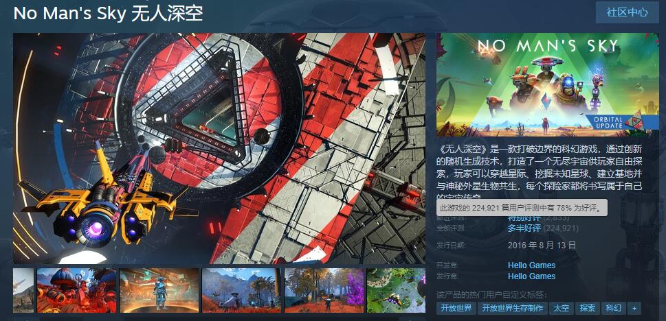 【《无人深空》负责人庆祝游戏Steam好评率上涨】太空科幻冒险游戏《无人深空》此前在Steam上的玩家好评率(全部)又上涨了一个百分点,达到了78%。开发商Hello Games创始人Sean Murray近期发文表示:“我们的作品《无人深空》现在好评率已达到了78%。自游戏2016年发售以来,我们用了五年的时间(2021年)才让本作的评价转变为‘多半好评(70%)’。从数字上来看,每提高一个百分点都很困难,虽然没想过可能会成为现实,但说不定有一天,这款游戏的评价会改为‘特别好评(80%)’。”《无人深空》目前在Steam上有着224921条评测,整体为多半好评。不过在近30天内的2833条评测中,玩家好评率高达92%。