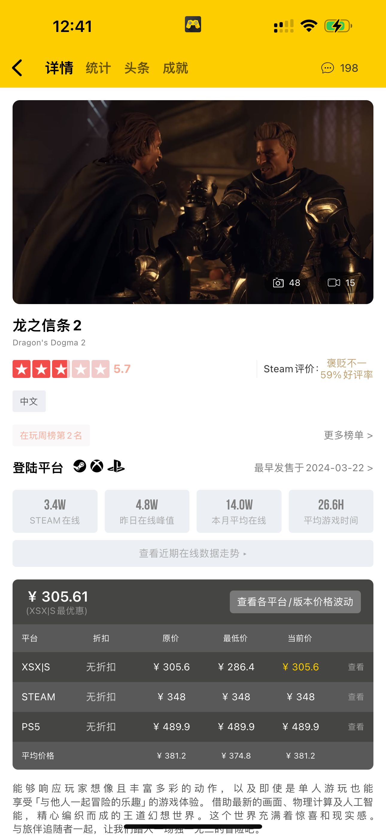 【发售不满一月《龙之信条2》玩家流失约80%】发售不满一个月,《龙之信条2》已有大量玩家暂时离开了这款游戏。根据数据显示,《龙之信条2》在上市后取得玩家峰值228585人的亮眼战绩后,这个数字就一直在下滑,最新的24小时统计中,本周末玩家峰值仅为47857人,当前在线35565人(各位柄友可以前往应用内游戏详情页查看各游戏的在线数据走势等游戏统计数据)。峰值玩家数量和刚上市时相比降低了约80%。