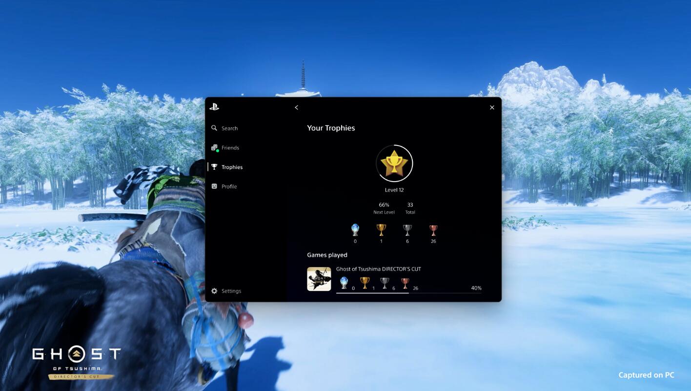 2、《对马之魂:导演剪辑版》是首款可在PC上使用“PlayStation Overlay”功能的游戏。玩家在PC上能直接关联并查看PSN账户的好友列表、奖杯、设置和个人资料。