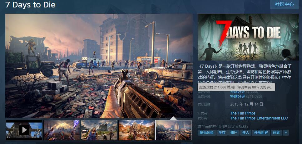 【《七日杀》将于6月推出正式版,目前为涨价前最后一次促销】The Fun Pimps宣布开放世界丧尸生存射击游戏《七日杀》将于6月退出抢先体验推出1.0正式版。届时游戏的价格也将会涨至44.99美元。为此官方提供了最后的促销机会,截至4月30日前,玩家可以76%OFF的价格(史低/18.72元)入手游戏。本作主机版预计在7月到来,根据更新路线图显示,跨平台联机功能预计会在今年第四季度推出。《七日杀》目前在Steam上已有211086条评价,玩家好评率为88%,整体为“特别好评”。