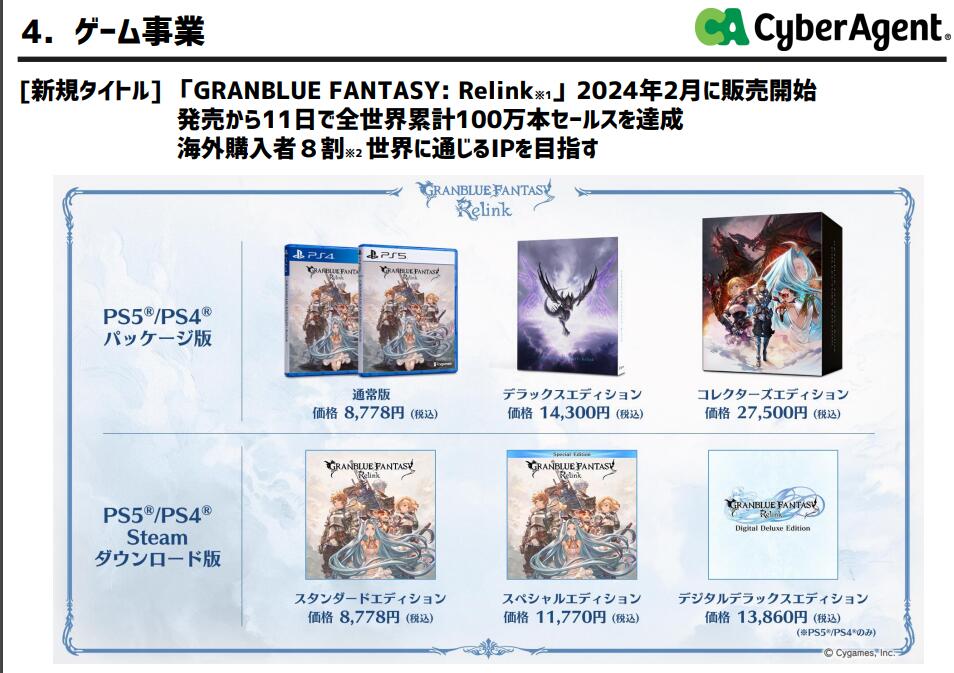 【《碧蓝幻想:Relink》8成销量来自海外,《觉醒计划》仍在进行中】Cygames的母公司CyberAgent公布了最新一期的财报文件。根据其中的内容显示,今年初上市的《碧蓝幻想:Relink》(本作上市11天后全球累计销量达100万份),其销量的80%来自海外。此外,该报告中还列出了公司旗下各作品的情况,在主机游戏方面上, 2016年所公布的“有生之年“项目《觉醒计划》仍在进行中。其他作品还有同样是发售日未知的《幻红战域:魔社术士之争》以及预计今年推出的《赛马娘Pretty Derby热血喧闹大感谢祭》。