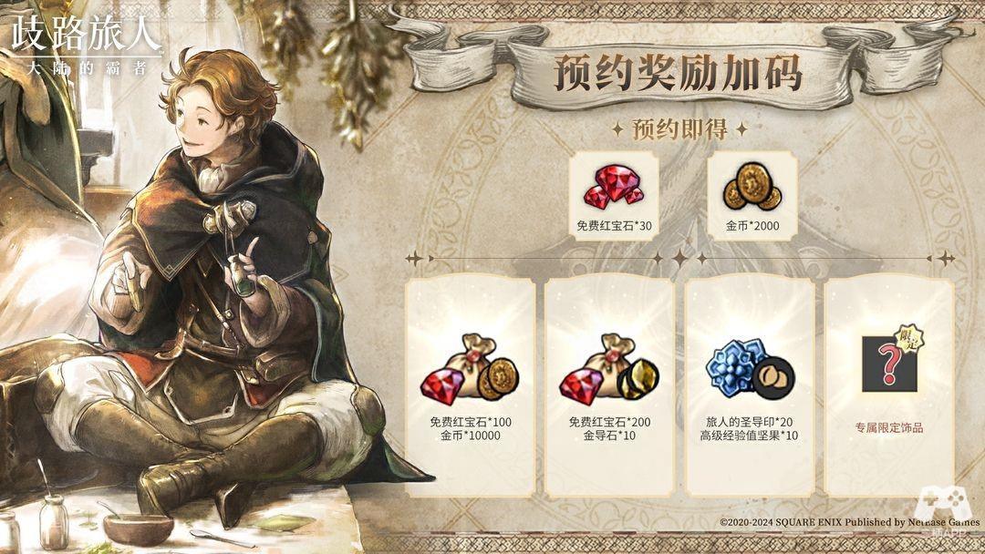 5月16日《歧路旅人:大陆的霸者》正式启程!各位旅人,我们奥鲁斯特拉不见不散!为了感谢各位旅人的陪伴和支持,所有预约奖励将在公测时全部发放,预约即得!现在预约,公测后旅人们可立得红宝石*330、旅人的圣导印*20、限定饰品以及其他养成材料, 神秘的国服限定饰品是什么呢?欢迎旅人们大胆猜测。