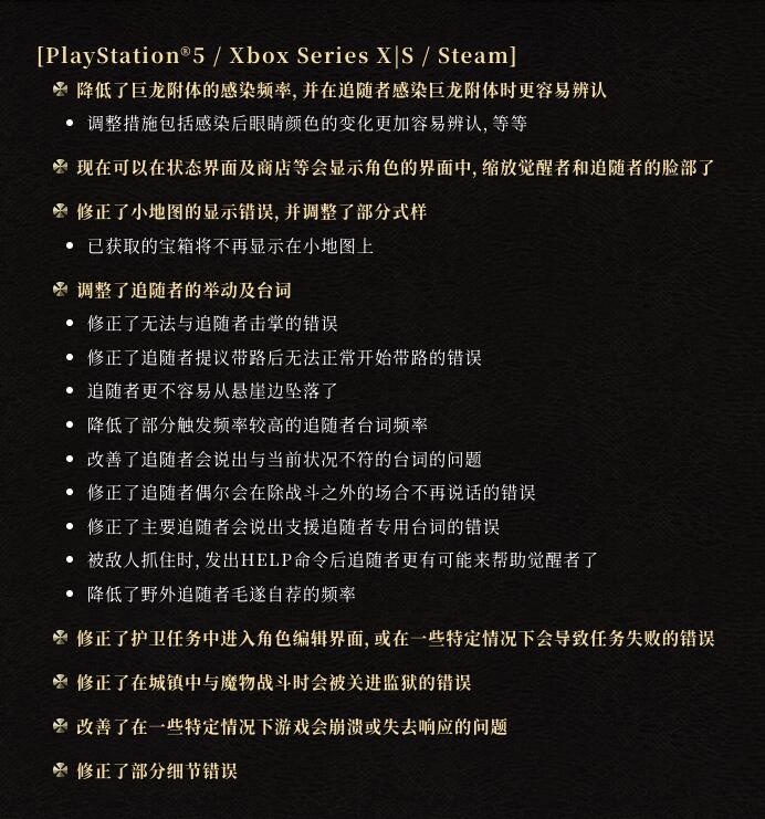 【《龙之信条2》更新现已上线,调整巨龙附体频率并使其更容易辨认】Capcom今日为《龙之信条2》推送了最新版本的更新,该补丁适用于全平台。此次的内容与之前预告的一致,主要是降低巨龙附体感染频率,并使追随者感染时更容易被辨认、追加缩放角色脸部功能、修正小地图显示错误、调整追随者举动和台词以及一些错误的修复(具体如图1所示)。《龙之信条2》已于3月22日在PS5、Xbox Series、Steam上推出,官方在4月2日时宣布游戏累计销量已达250万份。