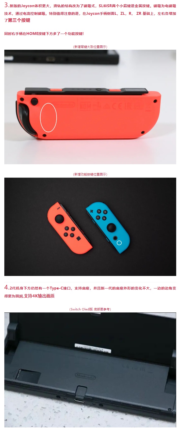 3、新版Joycon体积更大,滑轨结构改为“磁吸式”,SL和SR两个小肩键是金属按键。磁吸为电磁吸技术,通过电流控制磁吸。Joycon手柄侧面L,ZL,R, ZR 基础上,左右各增加了第三个按键。同时右手柄在HOME按键下方多了一个功能按键。