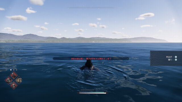6、《浪人崛起》:游泳接近边界时会提示“海上波涛汹涌,体力耗尽就会淹死”。