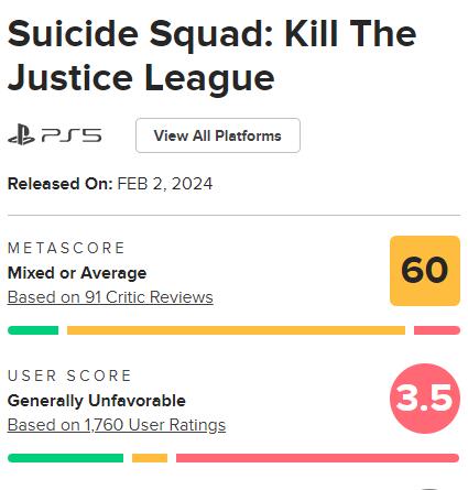 【《自杀小队》的失利给华纳带来2亿美元的收入影响 】华纳兄弟探索首席执行官David Zaslav在近期的财报会议中表示,《自杀小队:战胜正义联盟》是整个部门该季度业绩不佳的主要原因。David Zaslav说道:“我们的战略核心是以精彩的IP来讲好故事,我们有着被世人所爱的《哈利波特》《魔戒》《超人》等作品,它们都还未被充分利用。现在我们正在努力解决这些问题。期间不幸的是,继去年出色的《霍格沃茨之遗》后《自杀小队》的表现令人失望。第一季度的财报数据也因其变得严峻。”首席财务官Gunnar Wiedenfels指出,两款游戏发行之间的差异对第一季度的EBIDTA(摊销前盈利)有着2亿美元的影响。本作是由《蝙蝠侠:阿卡姆》的创作团队所打造的一款第三人称动作射击游戏。目前在MC上媒体均分60,玩家评分3.5,Steam上好评率72%(5333条)。