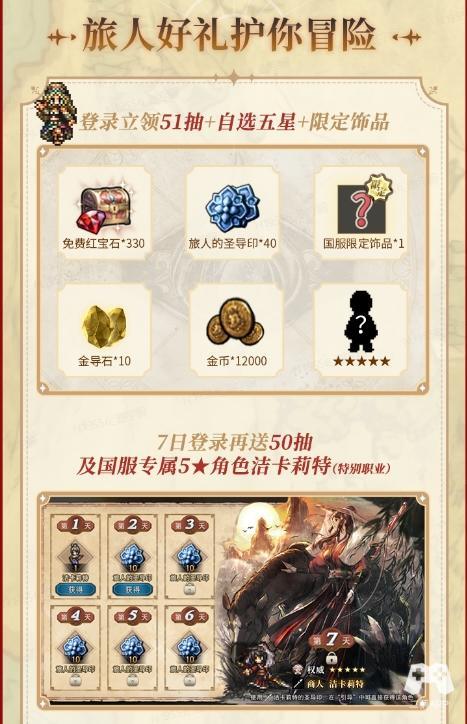喜迎公测到来,为感谢各位旅人们一直以来的关注与支持,《歧路旅人:大陆的霸者》为大家准备了重磅的福利,助力旅人们开启旅途冒险。旅人登录轻松获得免费51抽和国服限定饰品(预约奖励加码和公测邮件),首周达到一定游戏进度即可免费额外获得50抽和国服限定5星角色商人洁卡莉特(特别职业)。