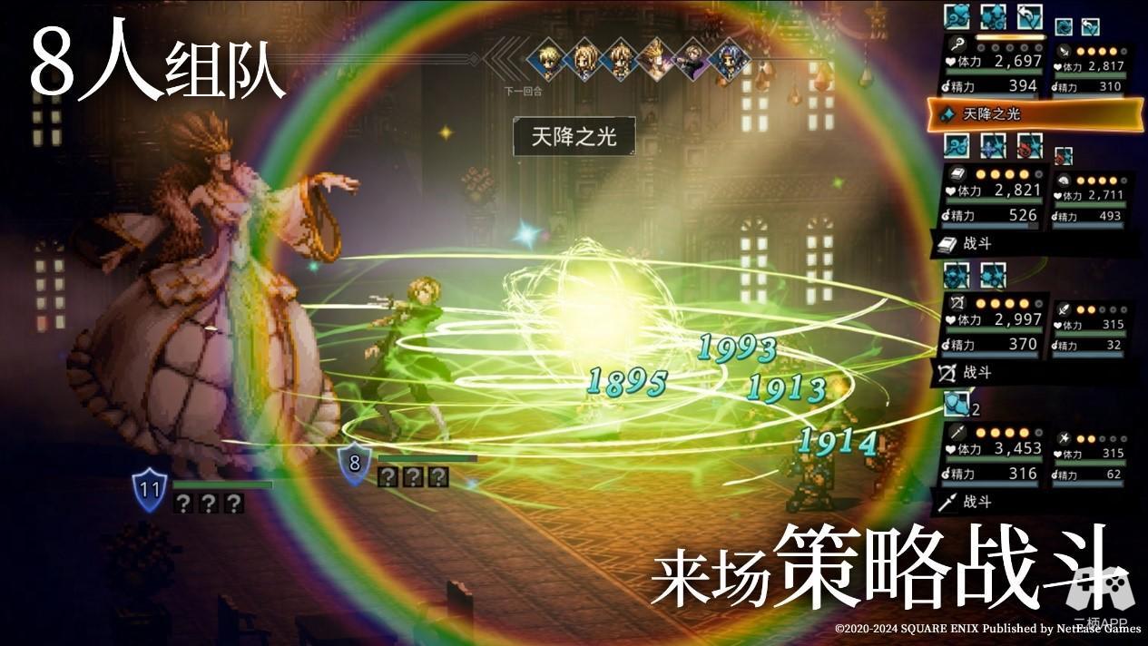 以经典系统为基础,《歧路旅人:大陆的霸者》在战斗玩法上进行了深度的策略性创新。游戏采用8人组队的回合制战斗系统,旅人可以从剑士、舞者、商人、学者、药师、游侠、猎人、星官这八大职业的角色中任选其一,每个职业都有各自独特的技能和属性。
