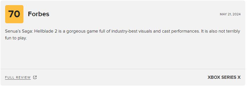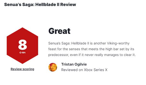 IGN:《地狱之刃2》带来了一场令人满意的残酷冒险之旅,不过作品更倾向电影般的场面而不是游戏的深度。本作场景十分生动,代价是XSX上只能以30帧运行,但视觉上所带来的效果是值得的。加上游戏还有着刺激的战斗、有趣的解谜、优秀的音效。总的来说本作达到了前作的标准,但未将其超越。(注:前作IGN评分为9)