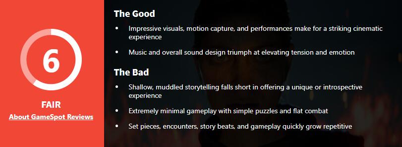 GS:这可能是迄今为止视觉效果最出色的Xbox游戏,但因过于强调电影效果而忽略了故事和游戏玩法,导致作品质量有所下降。本作结合动捕的表演的确为玩家们带来了一场令人惊叹的电影体验、音乐/音效的设计也提升的人们的紧张感和情绪。但单薄且混乱的叙事无法给人带来深刻的印象,游戏玩法及其简单、谜题和战斗也很平淡。结合起来会给人带来重复感。整体来说《地狱之刃2》未能达到前作的高度。