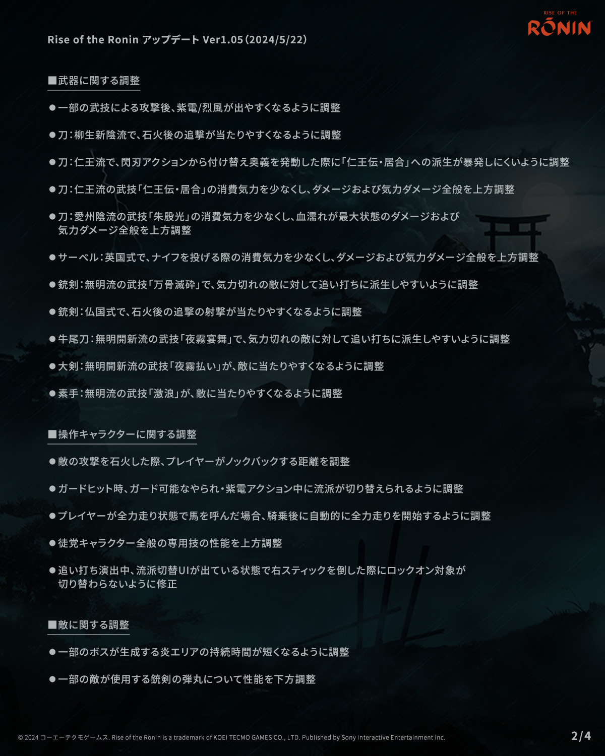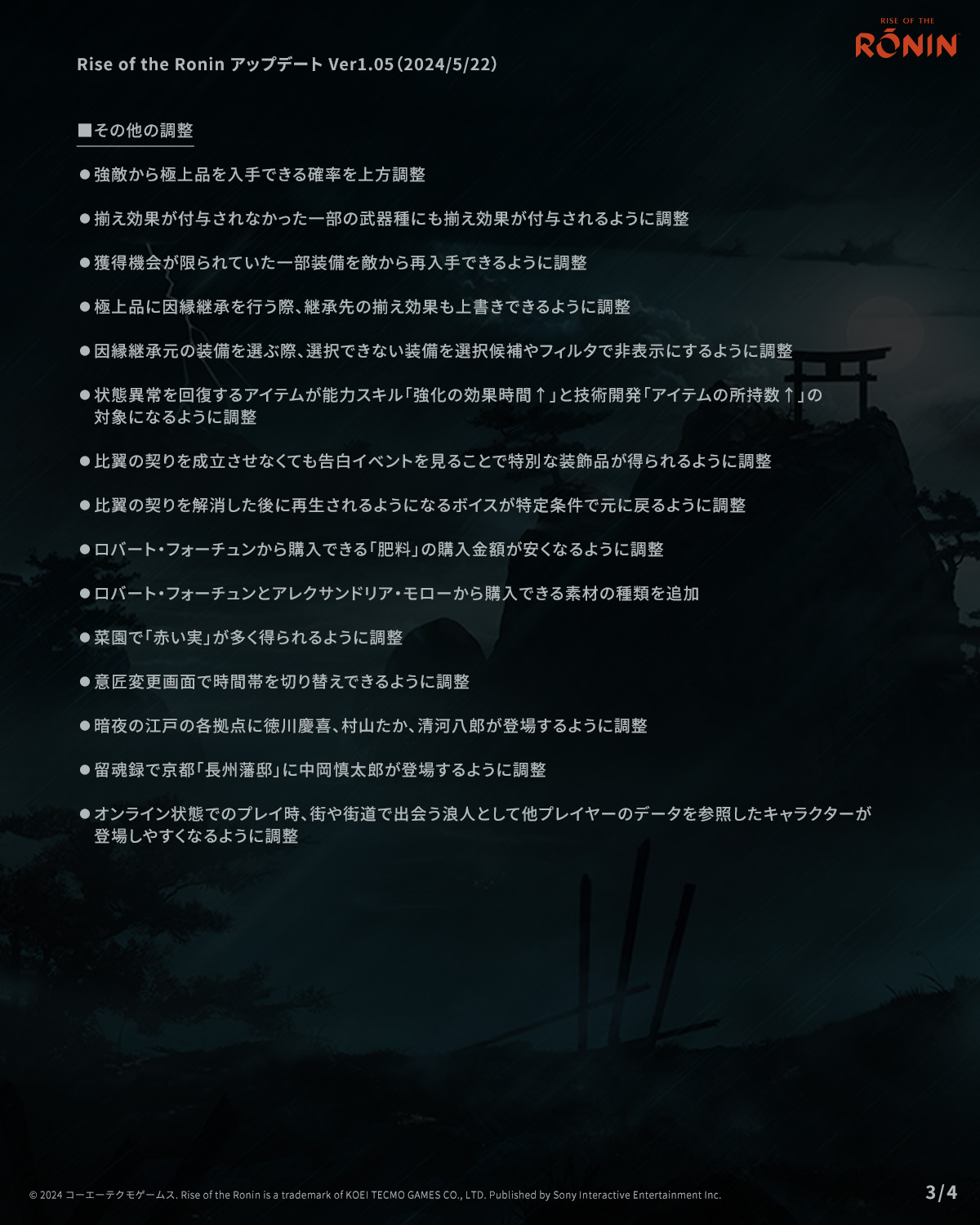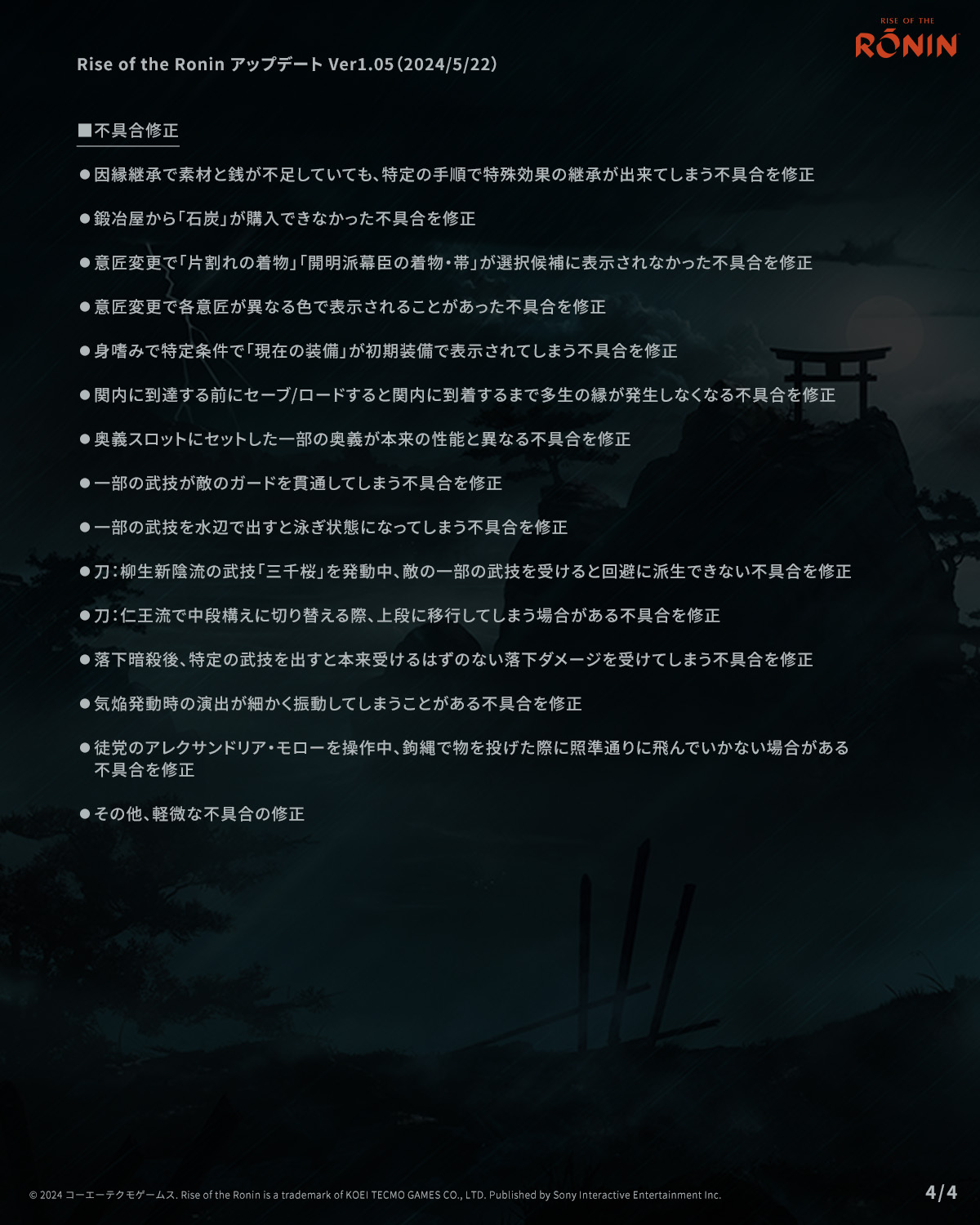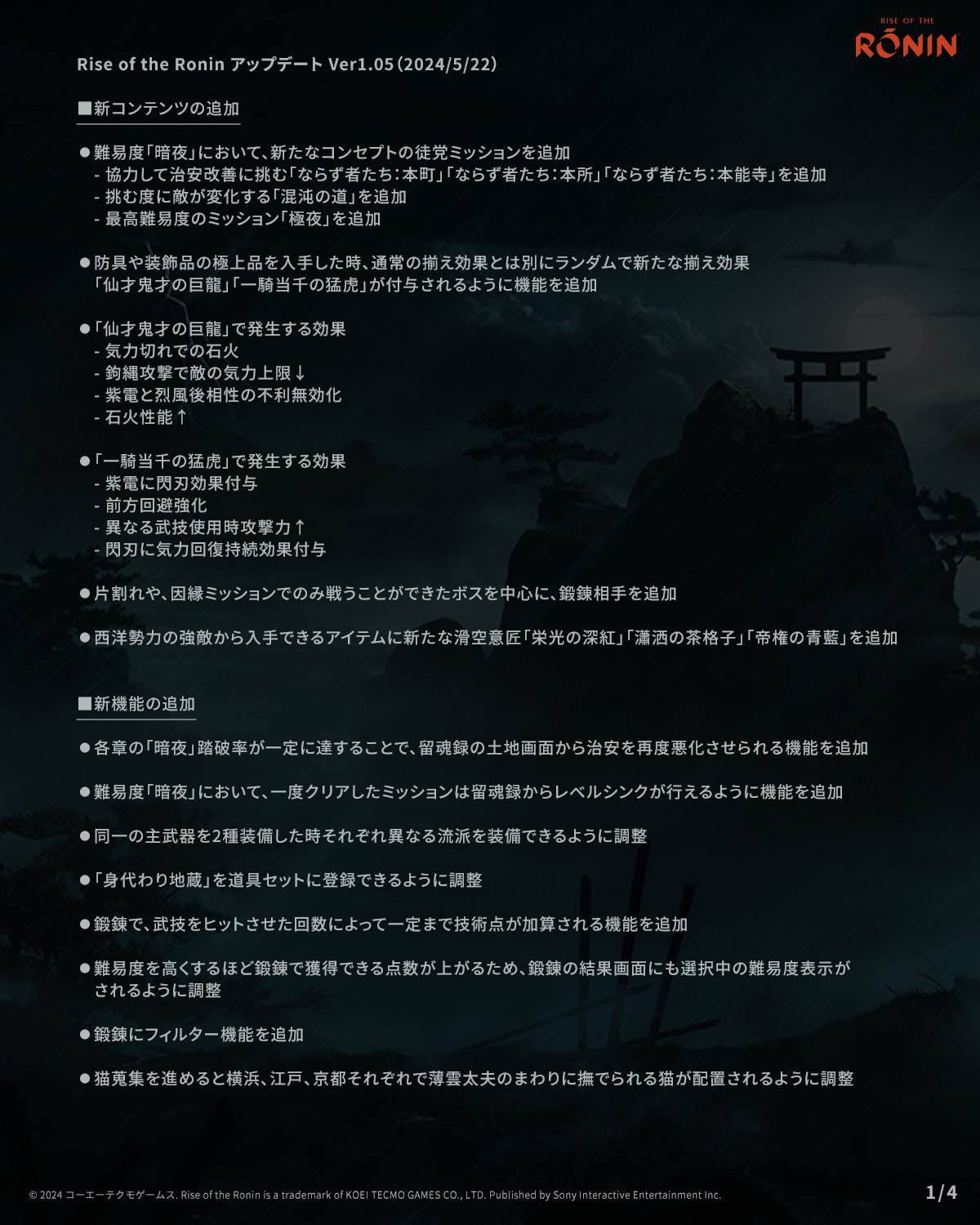 【《浪人崛起》1.05更新现已上线,追加并改进多项功能】Team NINJA近日为《浪人崛起》推出了1.05的版本更新,大小为1.36GB。部分要点内容如下: