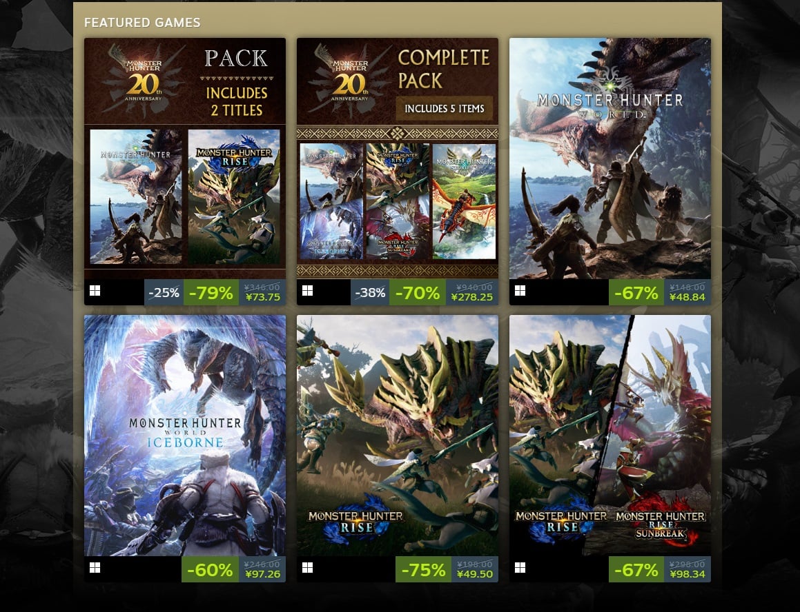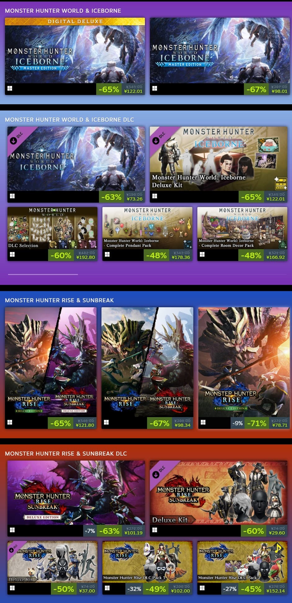 【为新作热身!Capcom开启《怪猎世界&崛起》特惠促销活动】Capcom今日开启了6月《怪物猎人》的特卖活动(截止日期PS版到6月12日23点/Steam到13日凌晨1点),其中(世界及其DLC在Steam上的价格迎来新史低):