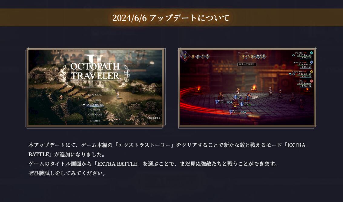 此外,《八方旅人2》今日还在全平台上推送了最新的版本更新。其中主要追加了“Extra Battle”模式,通关剧情后可在标题页面中选择该模式。玩家在里面可对各种强劲的敌人进行挑战(包括前作的角色)。