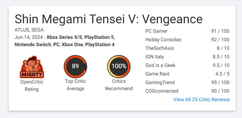 【《真女神转生5:复仇》MC媒体均分87】由Atlus所带来的《真女神转生5》决定版《真女神转生5:复仇》即将于6月14日发售。本作全球媒体评测现已解禁,游戏目前在MC上PS5版均分87(由24家媒体给出)、NS版87(7家媒体)、PC版91(19家媒体)、Xbox版媒体数过少未出分,Opencritic上均分89(暂收录25家媒体),部分媒体评价如下: