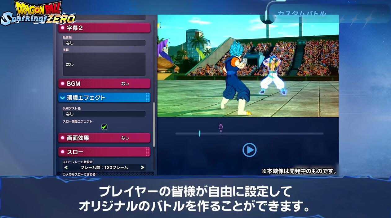 自定义战斗模式:可自由设定战斗选项的模式,其中提供了丰富的自定义内容,包括台词、演出效果等。玩家可以自己想象中的场景进行设置,战斗录像亦能保存并在网上分享。