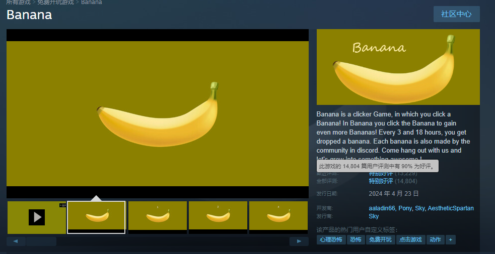 【赛博香蕉《Banana》Steam爆火,在线人数超70万】近日,一款免费游戏在Steam上爆火,该游戏名为《Banana》,顾名思义,这款游戏只是放置了一个香蕉和一个计数器,玩家点击香蕉一次便可加一点数,每过一段时间便会随机掉落各式香蕉,玩家可以通过在市场上交易香蕉获得Steam余额,目前市场上最贵的香蕉已经被卖到了13000元。通过SteamDB可知,这款游戏的24小时同时在线人数已经超过了70万,仅次于《Dota2》、《CS2》等游戏。目前《Banana》总评价数为14804,好评率90%,总体为特别好评。此外,本周早些时间开发者也证实,在当时的141000名玩家中,只有三分之一的人数为真实玩家数量,目前开发人员正在尝试和Valve合作删除游戏中机器人。