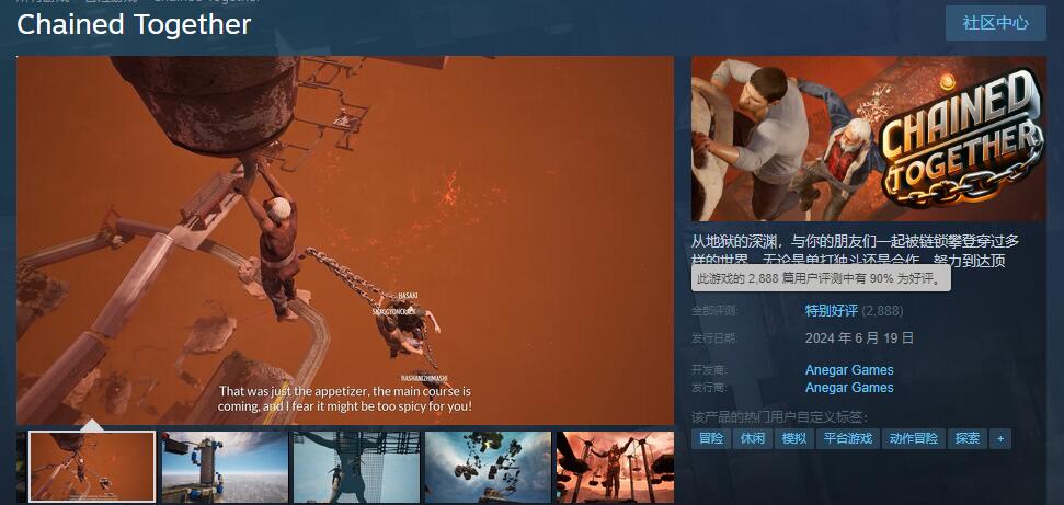 【“铁索连环多人版Only UP”《Chained Together》获玩家特别好评】由Anegar Games所带来的《Chained Together》(链在一起)已于日前在Steam上推出。游戏中玩家和同伴会被链在一起,任务是尽可能高的攀登并逃离此处,其中除了操作外,彼此间默契的配合也十分关键。截至目前,本作在Steam上已有2888条评测,好评率为90%,整体为“特别好评”。大部分玩家表示和伙伴们玩的非常愉快,尽管游戏暂不支持中文。《Chained Together》现在Steam全球热销榜中位居第5,国区第6。游戏售价22元,截至6月27日前,可以首发优惠-10%的价格19.8元入手。