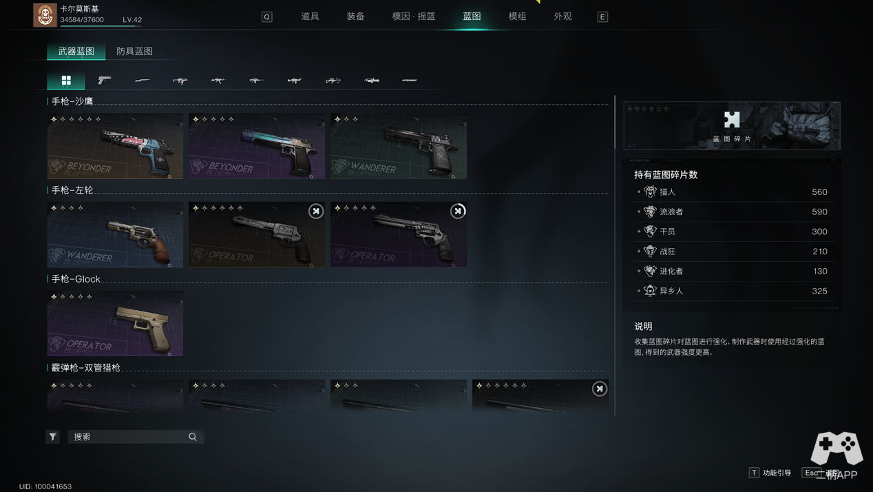在个人信息栏中,有一个蓝图的界面。当你拥有足够的蓝图碎片时,可以在蓝图界面,需要装备的武器下直接合成即可解锁该武器