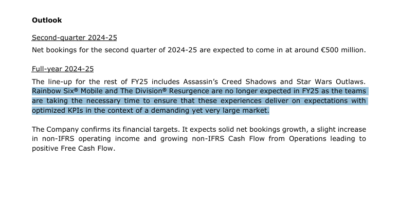 【《全境封锁 曙光》、《彩虹六号 移动版》再次被推迟发布】两年前,育碧曾在两年前发布《全境封锁 曙光》(《全境封锁》移动版)和《彩虹六号》移动版,并表示会在2023年秋季发布《全境封锁 复兴》,但由于未知原因并未发布。据Mp1st报道,在育碧最新的销售报告中,有提到这两款作品的推出时间将不会早于2026财年(2025年4月)。育碧表示:推迟发布的原因是因为团队正在花费必要的时间来确保这两款作品在目前庞大的手游市场下的表现。