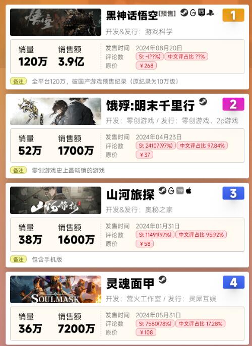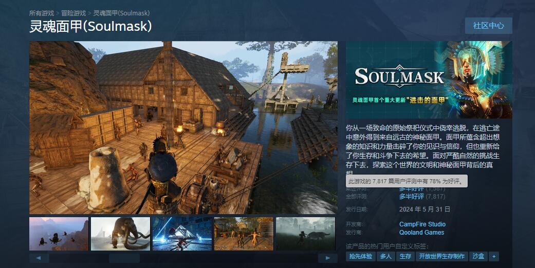 【生存沙盒游戏《灵魂面甲》销量突破40万】《灵魂面甲》官方今日发文透露,游戏累计销量现已突破40万份。本作是由CampFire Studio开发、Qooland Games发行的一款主打真实体验的生存沙盒游戏,今年5月31日在Steam上开启了抢先体验。官方在感谢玩家的同时,还承诺会在未来3个月带来更多的惊喜内容。其中包括:“神秘的古战士训练场”“ 新的植入体技术开发”“ 强大的皮肤系统开放”“ 全新的滑翔伞道具”“ 更多远古神秘科技”“ 开发者组件工具&社区Mod内容”等。 《灵魂面甲》现在Steam上正以史低价97.2元促销中(截至8月1日),目前游戏已有7817条评测,玩家整体好评率78%。在之前“国游销量榜”官博公布了2024上半年国游销量榜中,本作排名第四位。